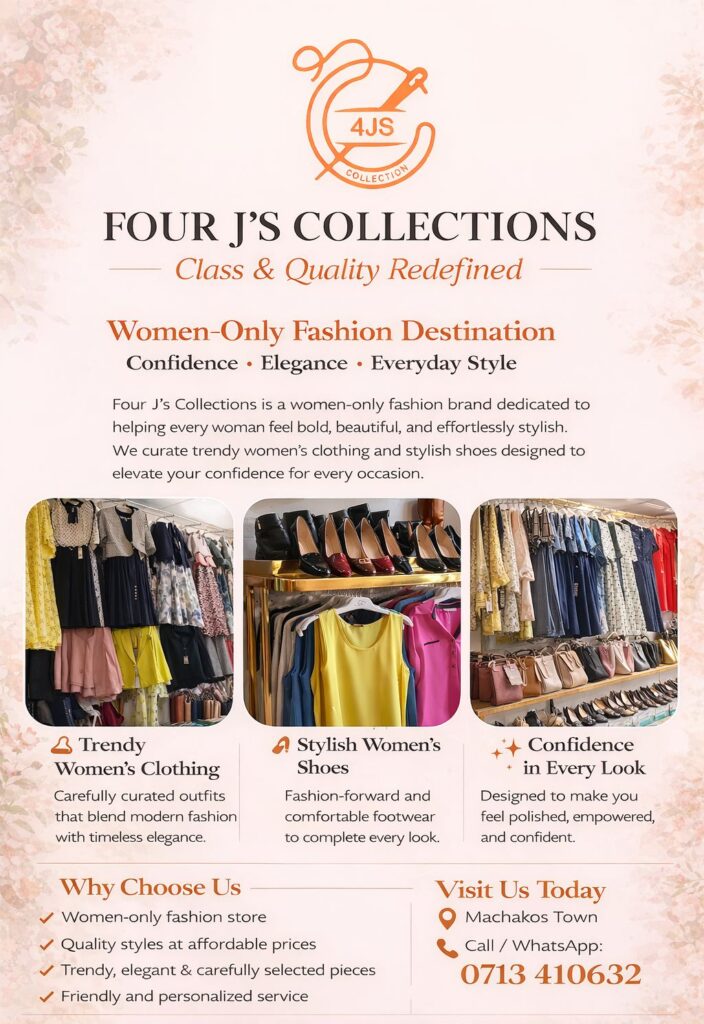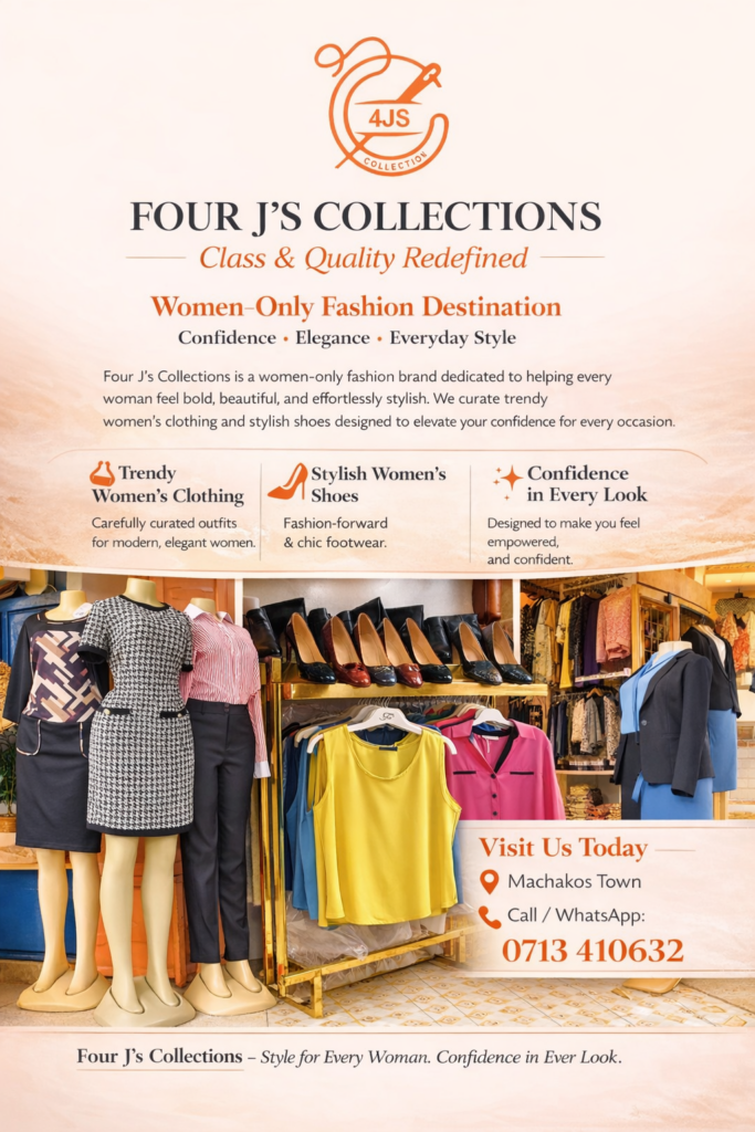 Four J’s Collections is a women-only fashion destination dedicated to confidence, elegance, and everyday style. Located in the heart of Machakos Town, we curate trendy women’s clothing and stylish shoes designed to make every woman feel bold, beautiful, and effortlessly put together.